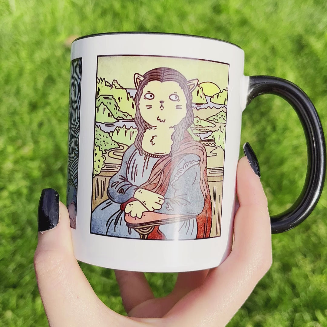Bring art and cats together in this playful and creative mug! Featuring a quirky cat reimagining three iconic masterpieces, this design adds a feline twist to classic art. From the serene and mysterious cat to the expressive one caught in a moment of dramatic emotion, and the dreamy feline swirling through a starry sky—this mug offers a unique blend of artistry and fun. Perfect for cat lovers and art enthusiasts, it's a delightful way to enjoy your favorite beverage while celebrating the beauty of art through a furry lens.an!